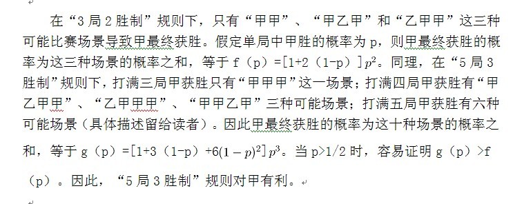 假定有甲、乙两个乒乓球运动员参加比赛,已知甲的实力强于乙。现有两个备选的竞赛规则:“3局2胜制”,或“5局3胜制”。试问:哪一种竞赛规则对甲有利?
