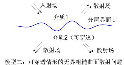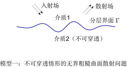 迄今为止,有界障碍反散射问题的理论与算法已得到非常广泛而系统的研究(Colton-Kress, 2013)。然而在诸如地质勘探、地震学、卫星遥感和无损探测等重要的实际应用中,往往还会遇到一类非常重要的反散射问题,即无界粗糙曲面反散射问题(对于散射模型的描述,参见图1和图2)。对于此类反散射问题,散射场不再满足通常的 Sommerfield 辐射条件,而是满足更为复杂的向上传播辐射条件(UPRC条件)。此外,由于测量条件的局限性,通常只能在上半空间获取有限孔径(limited aperture)的测量数据,这使得反散射问题的不适定性大大增加。进一步地,由于粗糙曲面的无界性,很多已有的反问题算法不再适用。因此,无界粗糙曲面反散射问题是一个非常具有挑战性的课题。