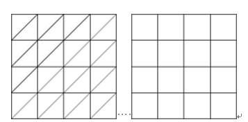 求解双调和方程的有限元格式,如果所采用分片多项式的总次数不高于 k 次而误差的能量模的收敛速度达到 O(hk?1) 量级, 则称此有限元格式是丰满的(optimal)。丰满格式的收敛速度和其使用的分片多项式空间互相对应地达到了理论上界和下界,是不可改进的,具有鲜明的临界特征。精度的丰满与否是刻画有限元格式的重要的定性特征,也易为其它知识背景的研究者所理解和接受,具有基本的理论意义,然而,一些看起来很简单的情形下,其设计问题仍未获得解决。例如,图1展示了正方形区域两种最典型网格。de Boor-DeVore-Hoellig 证明,在图左类网格上,三次连续可微有限元格式求解双调和方程必然会丢失一阶精度,三次丰满格式即付之阙如; 图右正方形网格上,求解双调和方程(甚至 Poisson 方程)的二次丰满格式亦无人知。这样的状况让人多少有些意外,也说明丰满有限元格式的研究仍有比较基本的意义和较大的空间。