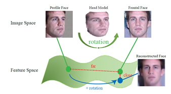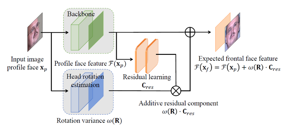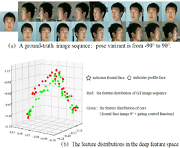 深度学习和海量数据集的涌现极大推进了人脸识别技术的发展。由于深度学习模型的泛化能力与训练数据的分布密切相关,而现有数据集大多集中在正脸数据,人脸识别技术的一个主要挑战来源于侧脸识别。现有方法常基于原始图像生成更多的不同角度的侧脸数据来扩充训练集,但引入了大量不必要的计算负担和训练成本。该工作旨在从侧脸图像恢复正脸的特征,从而进行高精高效的人脸识别。特别地,将李代数理论嵌入CNN的梯度运算及优化过程中,研究了人脸旋转变换影响CNN的深层特征生成的过程。在网络设计方面,通过设计了一个残差训练网络来学习侧脸图像中的旋转带来的影响;通过设计一个门控函数以平衡旋转对人脸特征的影响力度,最终生成相应的正脸特征(见图二)。
