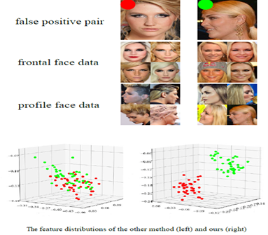 图三分别展示了LARNet 的特征表示能力——该网络能模拟任意角度的侧脸特征,且模拟数据分布接近真实数据的分布(左图),及LARNet的特征聚类能力——该网络可显著区分高度相似的挑战性案例(右图)。