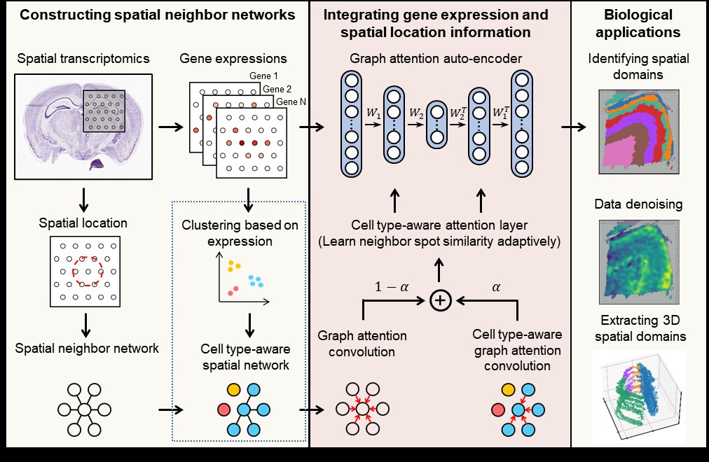 2022年4月1日,永利3044集团官网张世华课题组在Nature Communications发表了题为“Deciphering spatial domains from spatially resolved transcriptomics with an adaptive graph attention auto-encoder”的研究论文,针对不同空间转录组技术、不同生物组织建立破译生物组织空间亚结构的新工具-STAGATE。