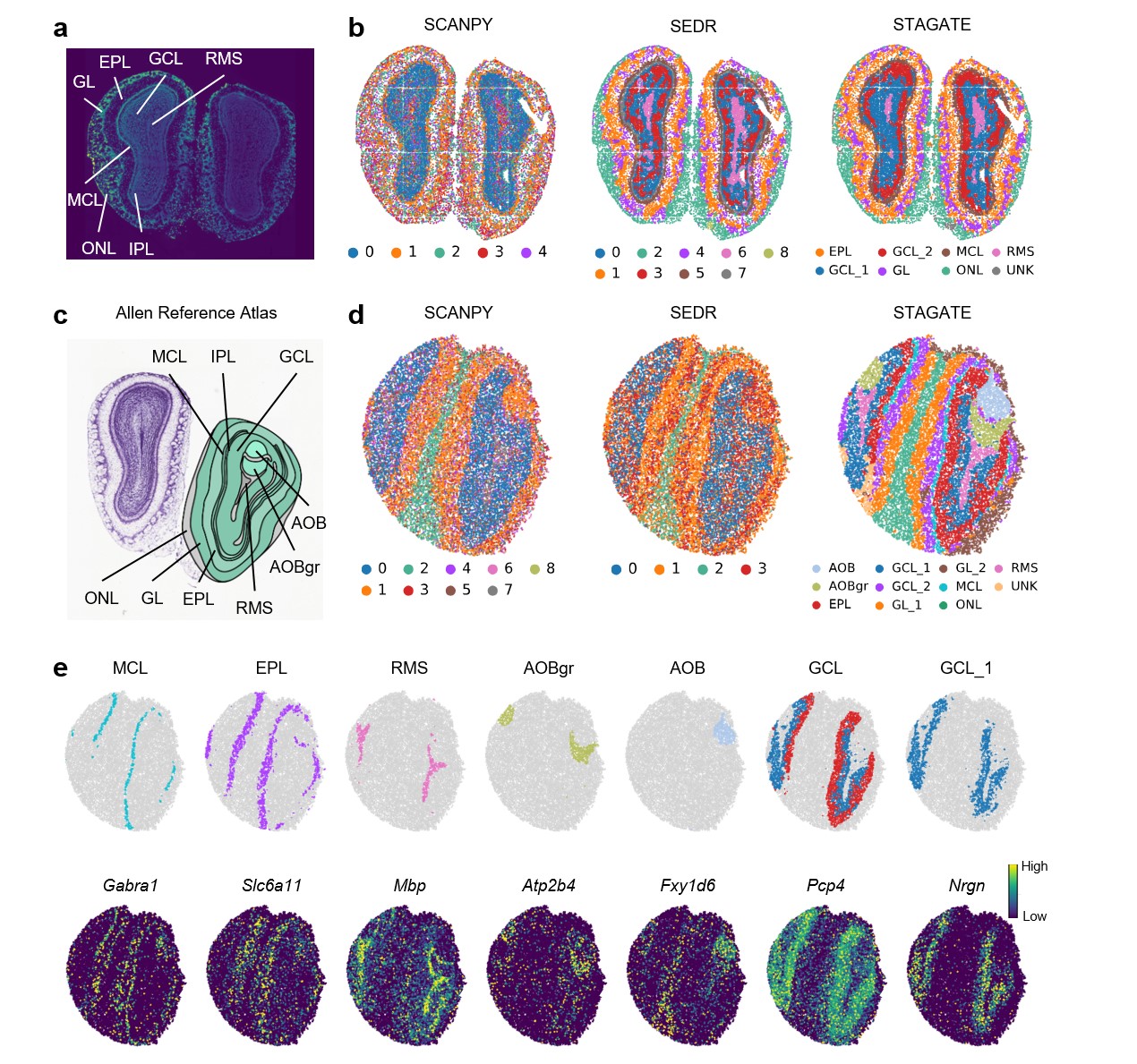 图2. STAGATE准确鉴别了两种不同技术Stereo-seq和Slide-seqV2空间转录组表征的小鼠嗅球组织切片的层状组织。