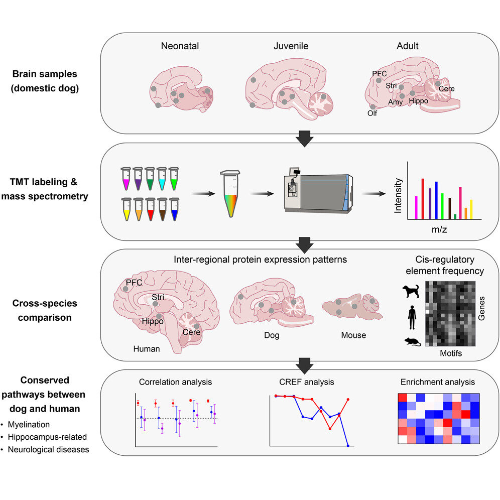 经过三万多年的家养驯化,家犬形成了特有的、高超的跨物种社会认知功能,是人类忠诚的朋友,也被认为是理想的神经精神疾病研究模型。6月20日,中国科学院遗传与发育生物学研究所研究员张永清团队、杜茁团队、汪迎春团队联合中科院数学与系统科学研究院研究员李雷,以及昆明动物所研究员王国栋和中科院院士、昆明动物所研究员张亚平团队在Molecular & Cellular Proteomics上,在线发表了题为Comparative proteome and cis-regulatory element analysis reveals specific molecular pathways conserved in dog and human brains的研究论文。研究联合利用10-plex TMT蛋白质组质谱技术和转录组测序技术,首次绘制了出生后家犬(Canis familiaris)大脑发育的蛋白质表达时空图谱,揭示了家犬大脑与人类大脑蛋白表达的保守性,以及自闭症、精神分裂症等风险基因在家犬大脑和人类大脑中的表达特征,并通过cis遗传调控元件分析解释了该保守性的潜在机制,为构建合适的神经精神疾病动物模型提供了重要参考。