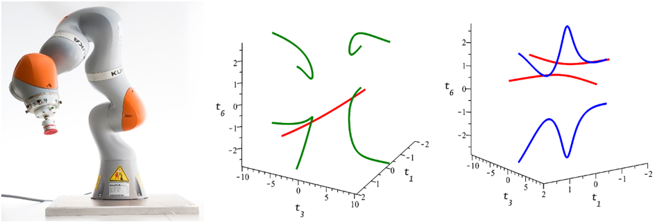 机械臂是目前应用最广的工业机器人。冗余机械臂是一类更加灵活、更适用于人机合作的工业机械臂,其运动学反问题与奇异性是机器人控制过程中的基础问题。数学机械化实验室李子佳副研究员与奥地利乔安娜研究所的Hofbaur教授等人合作,给出了一类冗余机械臂的运动学反问题的闭形式解。他们利用Gr?bner基等工具给出了详尽的机械臂运动奇异性分析。相关工作被机器人顶级期刊IEEE Transactions on Robotics发表,并受邀于2023年机器人技术领域最有影响力的国际学术会议IEEE International Conference on Robotics and Automation做全文报告。