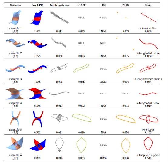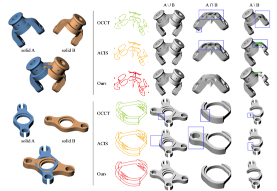 该算法与开源几何引擎OCCT、商业几何引擎ACIS、欧洲开源求交库SISL的求交算法进行密集对比测试,显示了在各种曲面相交复杂情形下的拓扑稳定性和计算高效性。该算法在Brep表示的CAD复杂模型的布尔运算应用中表现稳健,当模型发生相切相交、高度密切等复杂拓扑关系时可保证计算正确性。论文发表于计算机图形学顶级会议Siggraph Asia 2023,收录于计算机图形学顶级期刊ACM Transactions on Graphics。
