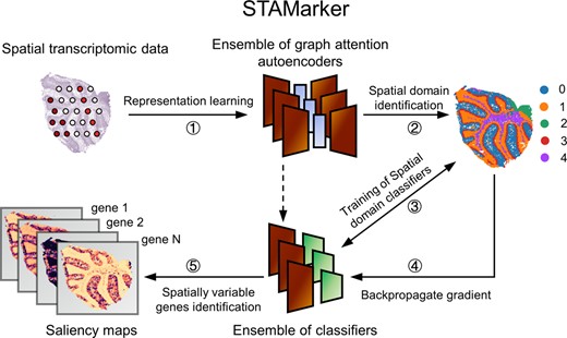 Spatial transcriptomics characterizes gene expression profiles while retaining the information of the spatial context, providing an unprecedented opportunity to understand cellular systems. One of the essential tasks in such data analysis is to determine spatially variable genes (SVGs), which demonstrate spatial expression patterns. Existing methods only consider genes individually and fail to model the inter-dependence of genes. To this end, we present an analytic tool STAMarker for robustly determining spatial domain-specific SVGs with saliency maps in deep learning. STAMarker is a three-stage ensemble framework consisting of graph-attention autoencoders, multilayer perceptron (MLP) classifiers, and saliency map computation by the backpropagated gradient. We illustrate the effectiveness of STAMarker and compare it with serveral commonly used competing methods on various spatial transcriptomic data generated by different platforms. STAMarker considers all genes at once and is more robust when the dataset is very sparse. STAMarker could identify spatial domain-specific SVGs for characterizing spatial domains and enable in-depth analysis of the region of interest in the tissue section.