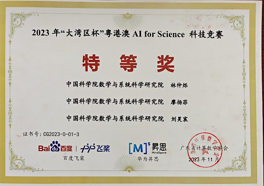 课题组的研究生利用基于张量神经网络的机器学习方法参加了2023年“大湾区”粤港澳AI for Science科技竞赛,在求解高维偏微分方程竞赛中得到了最好的精度,并获得了大赛的特等奖。