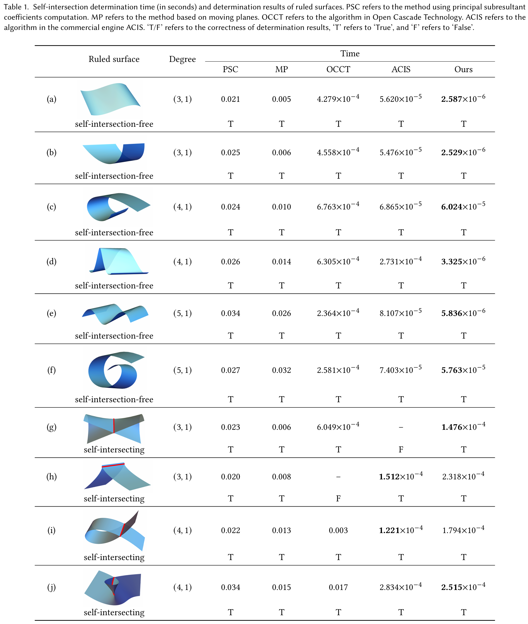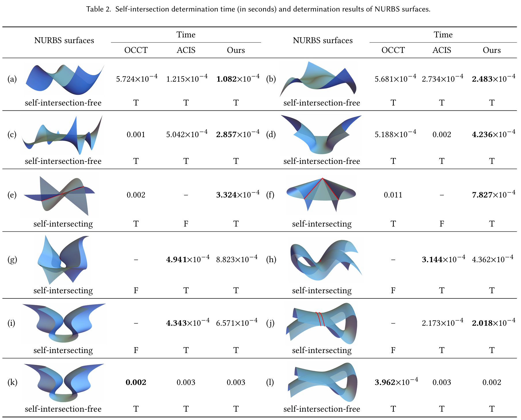 以上理论和算法研究可以用于CAD领域的NURBS曲面自交计算。然而,几何引擎核心工业软件对自交判定效率有极高要求,通常要求在毫秒内完成计算,过去的理论和算法难以达到。近日,项目组基于CAD中NURBS曲面表示本身的特殊性,给出了NURBS曲面自交的快速判别式,仅通过曲面控制点的简单线性组合即可指示曲面是否自交,避免了传统的对复杂代数系统的求解,平均判定效率达到10-4秒,同时也给出NURBS曲面自交线轨迹的快速计算算法。经与商业几何引擎ACIS、开源几何引擎OCCT的对标测试,该算法在自交线包含小环、奇点、斜接点等复杂拓扑情况下计算更为稳定[Li, Jia & Chen, ACM Transactions on Graphics, 2025]。