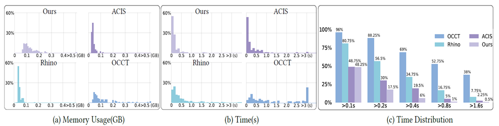 通过对上万个复杂Brep表示模型数据集的两两布尔交、并、差运算的测试,显示了该算法在效率上相较开源几何引擎OCCT、商业引擎ACIS、商业软件Rhino有显著提升,特别是可鲁棒处理各种复杂相交拓扑,在OCCT、Rhino、ACIS不同程度失败的复杂样例上给出正确的布尔运算结果。