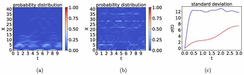 经典Sierpinski gasket(a)和量子分形网络(b)上的量子游走扩散的概率分布,(c)量子游走扩散的标准差,红色表示经典,蓝色表示量子。