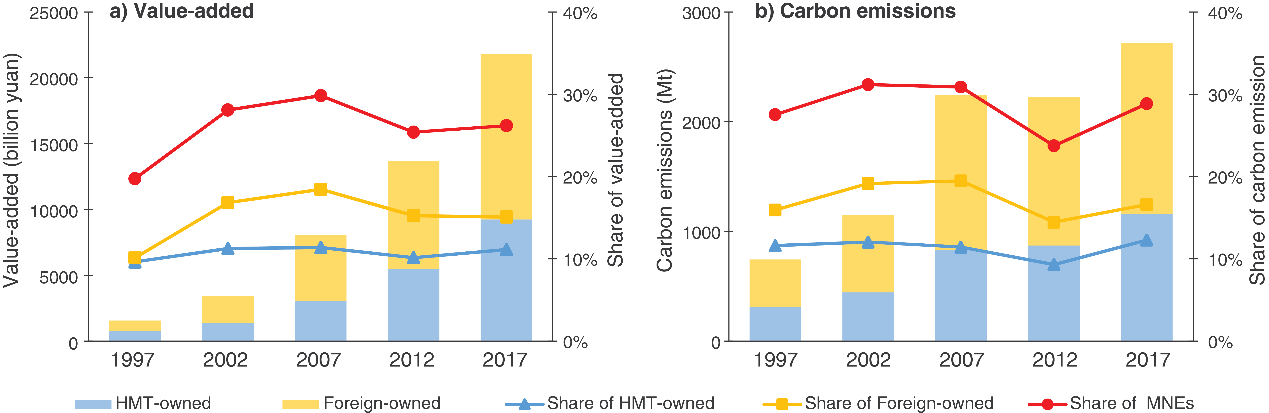 图1 港澳台资企业(HMT-owned)与外资企业(Foreign-owned)对我国增加值和碳排放的影响