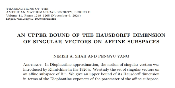 仿射子空间上奇异向量Hausdorff维数的上界(杨鹏宇与合作者)