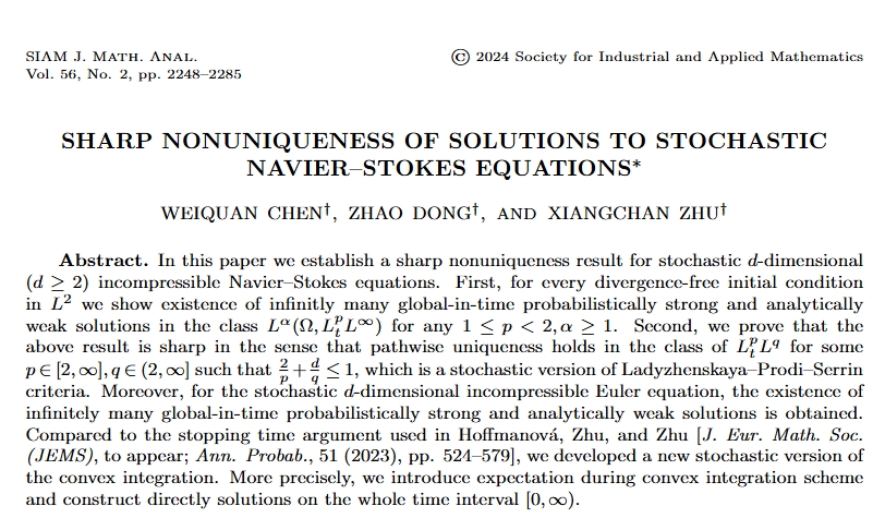 随机三维Navier-Stokes方程分布不唯一(朱湘禅与合作者)