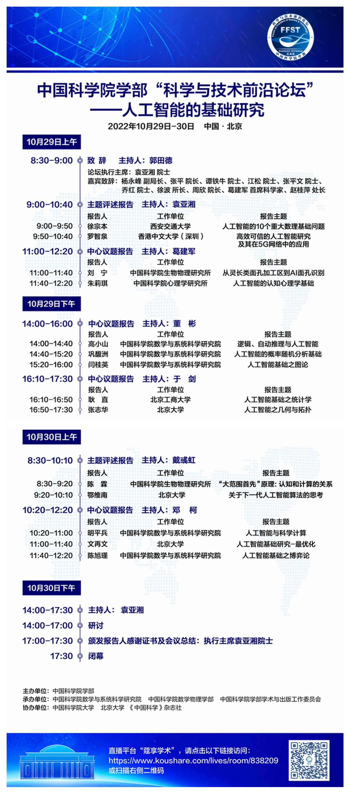 【2022.10.29-10.30 北京&线上直播】 中国科学院学部“科学与技术前沿论坛”——人工智能的基础研究