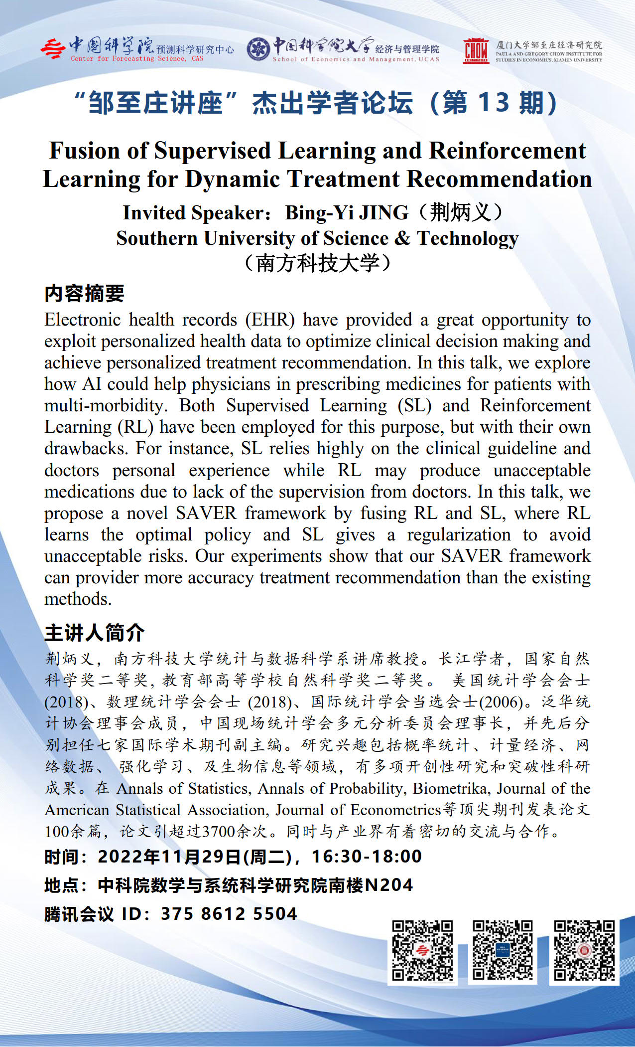 【2022.11.29-11.29 北京&腾讯会议】 “邹至庄讲座”杰出学者论坛(第13期)
