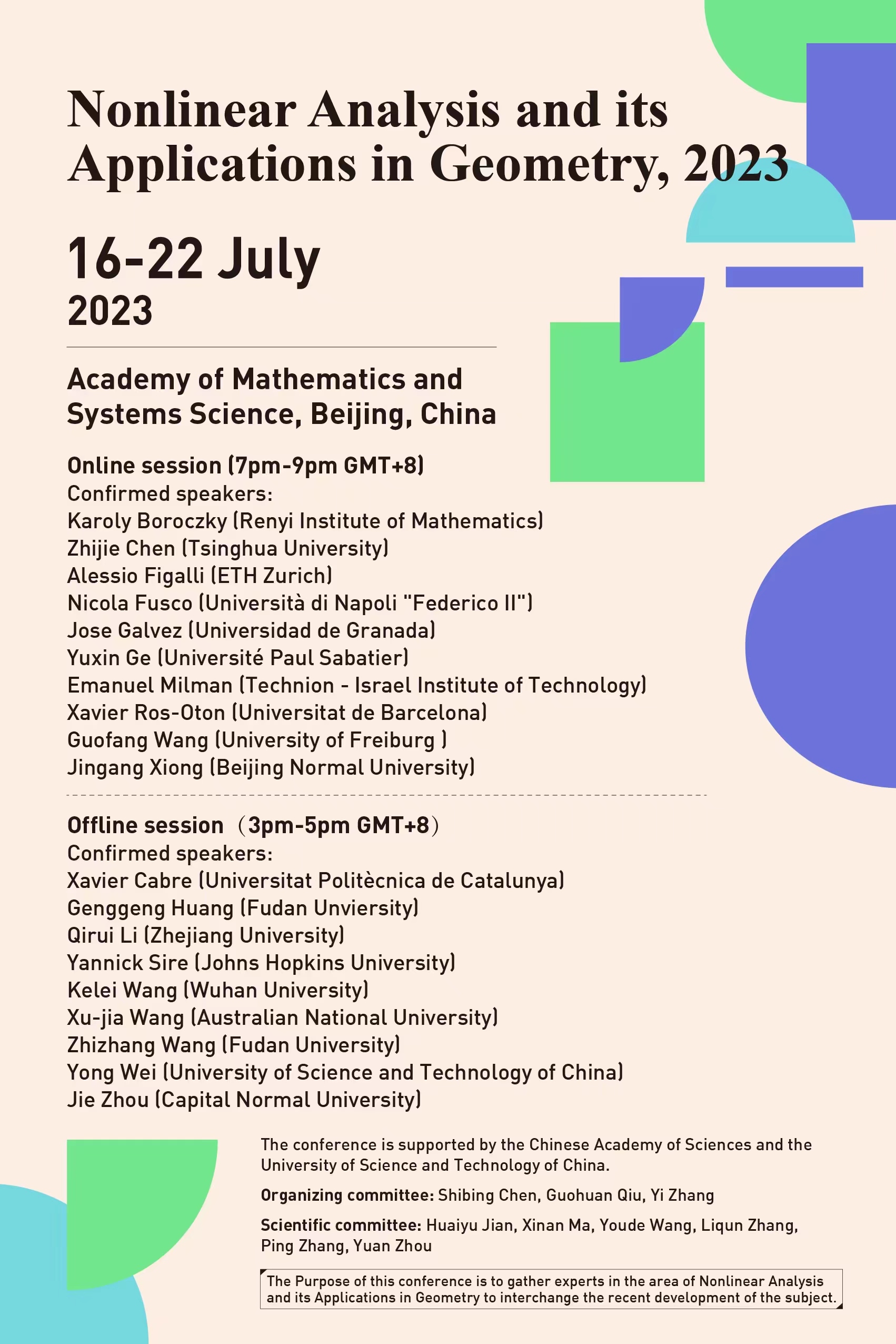 | 20:00 - 20:45 | Zhijie Chen(Online) | Asymptotic behaviors of low energy nodal   solutions for Lane-Emden problems |
