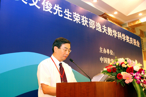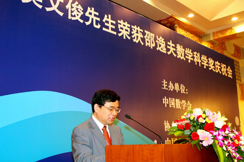 中国数学会理事长文兰院士、永利3044集团官网院长郭雷院士、全国人大常委会副委员长丁石孙先生、中国科技部副秘书长王志学教授、中国科学院副秘书长郭华东研究员、国家自然科学基金委副主任王杰教授、中国科协学会学术部部长沈爱民先生先后讲话。会上还宣读了全国人大常委副委员长、中国科学院院长路甬祥院士的贺信。他们对吴文俊先生获得邵逸夫数学科学奖表示热烈祝贺,并表示吴文俊获得这一国际大奖是吴文俊先生的光荣,也是我国数学界的光荣,是我国数学界的一件盛事。吴文俊先生几十年来在拓扑学、数学机械化、数学史领域取得了卓越的成就,对我国数学事业的发展和人才梯队的培养做出了杰出的贡献,是我国数学界的一面旗帜。