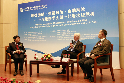 获得者北京论坛,在数学与系统科学研究院分会场举行了以“最优激励、道德风险、金融危机—与经济学大师一起看次贷危机”的主题报告会。来自中国科学院、高等院校、国家信息中心经济预测部、国家统计局景气中心的150余名专家学者和研究生参加了报告会。国内多家媒体对活动进行了采访报道。
