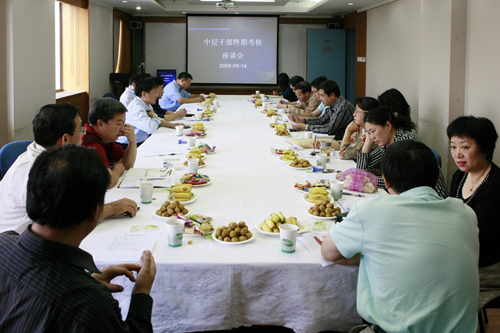 王跃飞书记在发言中说,本次中层干部终期考核改变了以往的汇报评审方式,而采取座谈形式,以力求大家能够畅所欲言,充分交流,切实改进管理工作。希望在今后的工作中,无论在本部门内,还是在各部门之间,努力构建和谐氛围、加强配合合作、更加充分地调动大家工作的积极性和主动性。