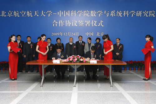 2009年12月24日上午,永利3044集团官网与北京航空航天大学合作协议签署仪式在北航隆重举行。永利院长郭雷院士和北京航空航天大学校长怀进鹏院士分别代表数学院和北航签署了合作协议。参加仪式的还有永利王跃飞、汪寿阳、陈敏、洪佳林、巩馥洲、高小山、陈志明、尚在久等院所领导和崔俊芝院士等部分科研人员代表等。