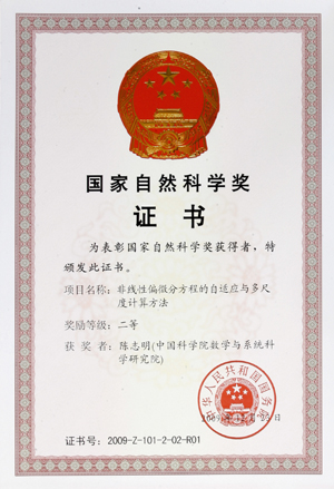 1月11日上午,2009年度国家科技奖励大会在北京人民大会堂隆重举行。党和国家领导人胡锦涛、温家宝、李长春、习近平、李克强出席会议并为获奖代表颁奖。数学与系统科学研究院计算数学所与科学工程计算研究所所长陈志明研究员的研究成果“非线性偏微分方程的自适应与多尺度计算方法”荣获2009年度国家自然科学奖二等奖。