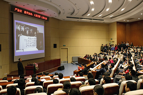 严加安院士首先通过一些精美的诗、书、画、雕艺术图片对老子“大道至简”的哲学思想和庄子“大美天成”的美学思想进行解读,说明科学和艺术是相通的,特别阐明数学和诗歌在创作理念和美学准则上的共性。然后用一些著名科学家发表短文或数量不多的学术论文而取得巨大成就的例子,诠释苏轼的“厚积薄发”名言,并通过许多科学家的名言和科学发现的故事就“创新”、“想象力”、“灵感”、“机遇”、“真与美”等治学理念和相关问题做深入剖析。最后,他向大家展示了自己的一些诗和书法作品,其中一首是他新近创作的诗《七绝:寄语青年学子》: “花可重开旧日枝,人无再返少年时;劝君岁月休辜负,莫待白头悔悟迟”。报告赢得阵阵掌声。