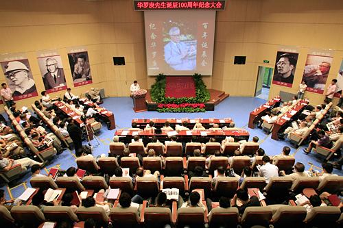 天空细雨蒙蒙,思源楼报告厅内气氛庄严热烈。主席台前鲜花簇拥,台口上方悬挂着“华罗庚先生诞辰100周年纪念大会”的会标,后幕正中是“感动中国•华罗庚”的巨幅图字,报告厅内两侧悬挂着八幅华老生前不同时期的巨幅画像,来宾仿佛亲耳聆听华老的谆谆教诲,亲身体验华老的殷切指导,场面温馨而感人。