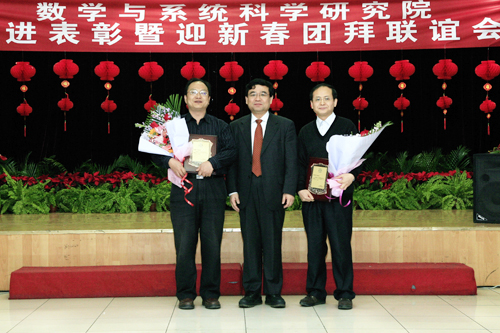 为加强永利高层次人才队伍建设,吸引、遴选和造就一批具有国际领先水平的学科带头人和青年骨干,从2008年开始,永利实施了人才战略计划。团拜会上汪寿阳副院长宣读了研究院聘任2010年“特殊人才计划”入选者的决定。周向宇研究员和巩馥洲研究员当选第三届 “华罗庚首席研究员”,郭雷院长为他们颁发了证书;刘劲松副研究员、王益助理研究员、张世华助理研究员、李启寨副研究员、邸亚娜副研究员、赵延龙助理研究员当选第三届“陈景润未来之星”,研究院学术委员会副主任马志明院士、陈翰馥院士为他们颁发了证书。周向宇研究员作为“特殊人才计划”入选者代表讲话。