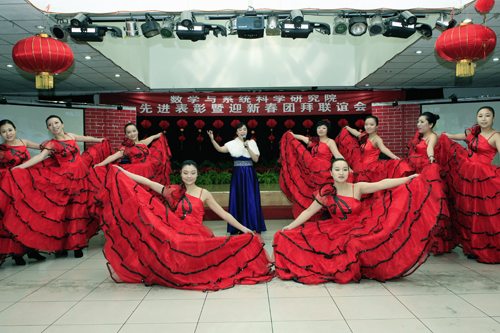 随后,永利职工、离退休同志和研究生献上了精彩的文艺演出。热闹喜庆的歌伴舞《和谐中国》(期刊学会部、综合处表演)拉开了演出的序幕,配乐诗《我的祖国》(数学所华罗庚数学实验室表演)朗诵出了大家心底对祖国的无限热爱之情,轻松幽默的三句半《说说我们数学院》(科研处、人力资源处表演)赢得了阵阵掌声,群口快板《话说经济拜大年》(系统所管理、决策与信息重点实验室表演)引人发笑又使人深思,《心中永远的橄榄树》(计财处、研究生部表演)透漏出一种沧桑,恬静优美的《肖邦降E大调夜曲》(应用数学所博士研究生葛旸演奏)倾诉着心灵的话语,高亢而深沉的《滚滚长江东逝水》(洪佳林副院长演唱)令人荡气回肠,《新年好》(四所领导演唱)带来了新年祝福,《说对联》(黄一鸣表演)给大家上了一节生动的“对联课”,《老歌联唱》(图书网络中心、期刊学会部演唱)让大家梦回那美好的年代,《又一首歌》(应用数学所第二党支部演唱)给人以振奋与进取,《红旗飘飘》(系统所数学机械化重点实验室演唱)激情澎湃,《卓玛》(物业安全中心王志强演唱)悠长深情,《为了谁》(数学所张平、武建丽演唱)温情祥和,《小笑话》(计算数学所袁亚湘研究员表演)与《售楼》(研究院青联、团委选送)令人捧腹,《让我们荡起双浆》(计算数学所演唱)欢快清新。最后让人眼前一亮的是《红歌联唱》(研究院机关青年表演),众人身着军装,一展青年职工风采,展现了永利年轻职工积极向上的精神面貌和风采。