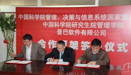 3月11日,中国科学院管理、决策与信息系统重点实验室联合中国科学院研究生院管理学院与普巴软件有限公司签署了合作框架协议。三方将成立联合实验室,共建研究生和MBA实习基地,合作开发和研究新的产品和系统。三方还将设立“普巴优秀奖学金”以鼓励优秀人才的培养。中国科学院研究生院管理学院执行院长吕本富,中国科学院管理、决策与信息系统重点实验室主任杨晓光,普巴软件有限公司总裁夏春秋代表三方签署了合作协议。