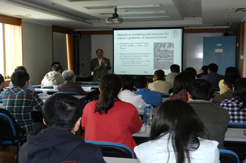 在报告中,吴建福教授介绍了他的研究团队提出的一种空间填充设计方法——序贯最小位能设计(SMED),该方法的提出是受纳米线合成问题的启发,旨在为复杂黑盒函数搜寻最优条件。他详细讲解了SMED这一新颖的实验设计生成方法,着重指出了SMED不依赖于模型、可快速消除无纳米结构观测区域、可搜寻复杂响应曲面、用于序贯实验的特点。同时他指出,这种方法亦可看做是对随机函数的序贯设计和对确定函数的全局优化。吴教授还特别提到了在佐治亚理工学院学习的统计室博士研究生庹睿在这一方向上具有创新性的研究成果。