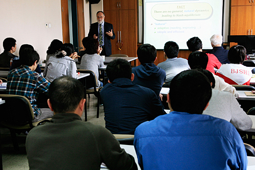 在上午的“Game Dynamics and Equilibira”报告中,Sergiu Hart教授围绕着纳什均衡和相关均衡的动态可达性展开了讲解。他先用通俗语言解释了目前尚无简单、自然、迅捷的动态过程使得对于任意的博弈纳什均衡都可以达到这一事实,然后利用“非耦合动态”(uncoupled dynamics)和“通讯复杂性”(communication complexity)的概念给出严格的理论表述,并概述了证明的核心思想。Hart教授还阐述了为什么两个均衡概念在动态可达性方面会有如此大的差异,并提出了“协调守恒律”(Law of Conservation of Coordination)的思想,即纳什均衡概念里缺乏协调,从而需要较长的动态过程达到均衡;而相关均衡概念里已经有了协调,从而较短的时间就可以达到均衡。
