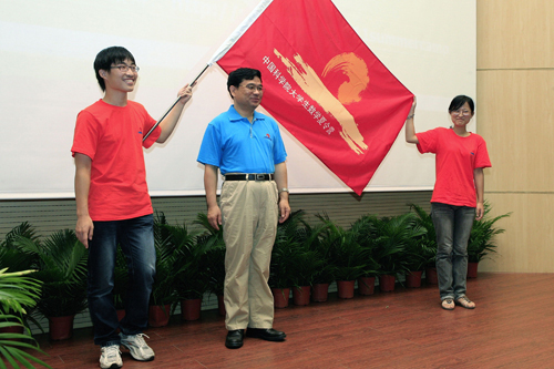 在全场热烈的掌声中,郭雷院长为夏令营授旗,营旗徽标的设计简洁大气寓意深刻,壮阔的海面上一轮喷薄而出的太阳,象征着数学人的自信、青春和力量。中国科技大学华罗庚班2009级刘冰萧同学代表全体营员发言,表达了对数学家们的敬佩,对数学殿堂的憧憬与向往。在同学们的热切期待中,副院长汪寿阳宣布“2011年中国科学院大学生数学夏令营”正式开营。