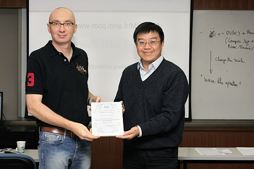 10月21日,国家数学与交叉科学中心综合报告会第十场在晨兴大楼举行。法国巴黎高科和国家信息与自动化研究所 Claude Le Bris教授受国家数学交叉中心邀请,作题为“Computational multiscale materials science: some highlights”的报告。国家数学与交叉科学中心主要领导及50余位科研人员及学生出席报告会。报告会由国家数学与交叉科学中心材料环境研究部主任、计算数学所所长陈志明研究员主持,并向Le Bris教授颁发讲座证书。