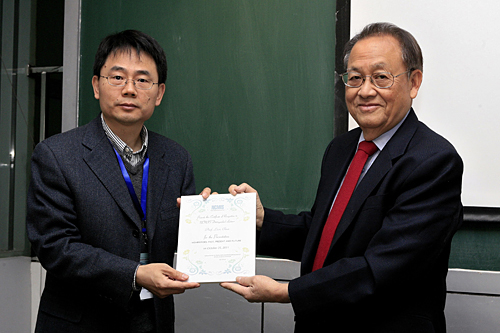 10月25日,国家数学与交叉科学中心综合报告会第十一场在晨兴大楼举行。加州大学伯克利分校 Leon Chua教授受国家数学交叉中心邀请,作题为“Memristors: Past, Present and Future”的报告。国家数学与交叉科学中心主要领导及40余位科研人员及学生出席报告会。报告会由国家交叉中心副主任、系统所所长高小山研究员主持,并向Leon Chua教授颁发讲座证书。
