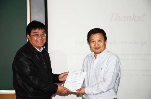 11月2日,国家数学与交叉科学中心综合报告会第十二场在思源楼举行。新加坡国立大学Shen Zuowei教授受国家数学与交叉科学中心邀请,作题为“MRA based wavelet frame and applications”的报告。国家数学与交叉科学中心主要领导及30余位科研人员及学生出席报告会。报告会由国家数学与交叉科学中心材料环境研究部主任、计算数学所所长陈志明研究员主持,并向Shen Zuowei教授颁发讲座证书。