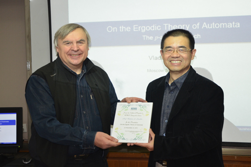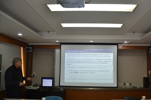 Vladimir S. Anashin 教授的报告围绕自动机映射的遍历理论进行。主要介绍自动机映射与p进遍历理论的相关问题研究;报告介绍了该领域的一些最新进展,包括其本人新证明有关Van der Put级数的自动机有限性准则,该准则揭示了有限域上的形式幂级数代数性质与Christol定理的内在联系。最后还提出了一些未解决的公开问题。报告引起与会听众的广泛兴趣和热烈讨论。