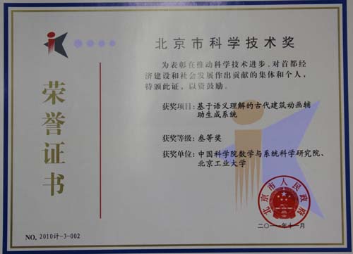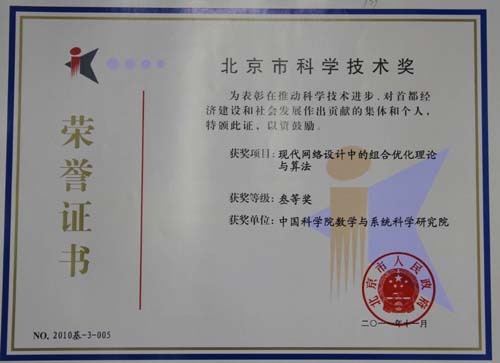 2012年4月13日上午,2010-2011年度北京市科学技术奖励颁奖大会在京召开,永利闫振亚完成的项目“构造性理论与算法及其在复杂非线性系统中的应用”获得2011年度北京市科学技术二等奖,胡晓东、杨晓光、陈旭瑾、蔡茂诚等完成的项目“现代网络设计中的组合优化理论与算法”及张松懋、陆汝钤、孙凯等完成的项目“基于语义理解的古代建筑动画辅助生成系统”分别获得2010年度北京市科学技术三等奖。