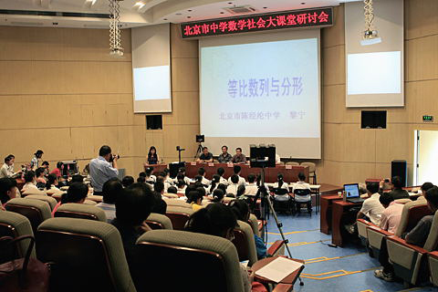 北京陈经纶中学的黎宁老师讲了《等比数列与分形》的示范课。之后,安鸿志研究员以及一些中学数学老师对这节课从选题、形式到内容进行了点评,还提出了一些建议。接着,田野研究员作了题为“同余数”的科普报告。他深入浅出地讲解了几何与代数这些不同的数学知识单元之间的内在联系,向听众展现了数学研究过程的奥秘和魅力。