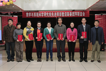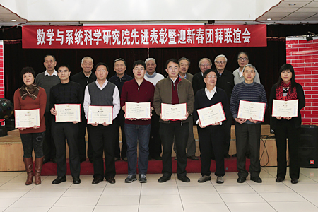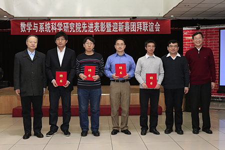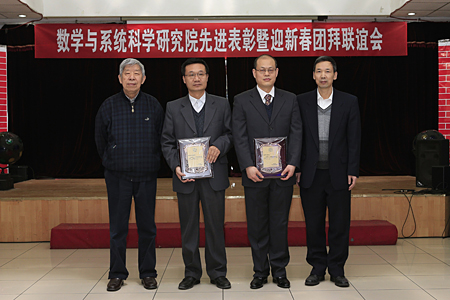 团拜会上学术院长席南华院士宣读了研究院聘任2012年“特殊人才计划”入选者的决定。其中,张平当选第五届“华罗庚数学首席研究员”、骆顺龙当选第五届“华罗庚应用数学首席研究员”,杨乐主任、席南华院长颁发“冠名首席研究员”入选者证书;学术委员会副主任马志明院士、郭雷院士、袁亚湘院士为第五届“陈景润未来之星”的入选者:魏达盛、曹周键、李韬、刘波、于海军颁发了证书。张平研究员作为“冠名首席研究员”代表讲话,他表示身为数学院的后来人,一定要发扬和继承数学院老一辈数学家爱数学和爱国的精神,为把我国从数学大国质变到数学强国而做出不懈的努力!