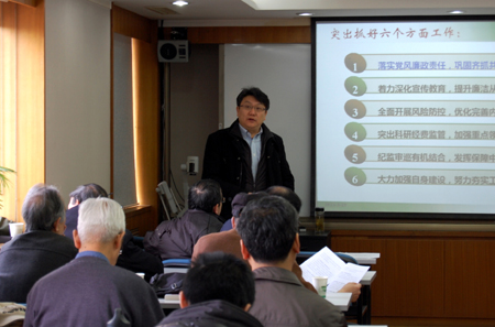 会上,永利党委副书记、纪委书记武艰简要总结了永利党委、纪委2012年各项工作,并介绍了2013年永利党建工作要点。武艰书记重点传达了中科院2013年纪监审工作会议精神。2013年中科院反腐倡廉工作目标是:深入推进惩防体系建设,保障创新“2020”顺利实施;要点是突出重点,扎实开展风险防控,发挥合力,加强重点领域监督;工作基础是提升能力,加强队伍建设,健全体系,巩固工作网络。风险防控工作的思路和重点是抓好“一”个目标——惩治和预防腐败体系建设;强化“两”个抓手——廉洁从业风险防控,科研经费财务收支审计;夯实“三”项基础——思想认识基础、组织队伍基础、体制机制基础。