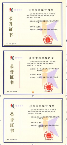 2014年3月25日上午,2013年度北京市科学技术奖励颁奖大会在京召开,永利汪寿阳、杨晓光、尚维、张珣完成的项目“经济预测预警理论方法及决策支持系统”、郭宝珠等完成的项目“Riesz基理论对无穷维振动系统的镇定与应用”获得2013年度北京市科学技术二等奖,丁彦恒和张志涛完成的项目“极小极大理论及其对非线性变分问题的应用”获得2013年度北京市科学技术三等奖。