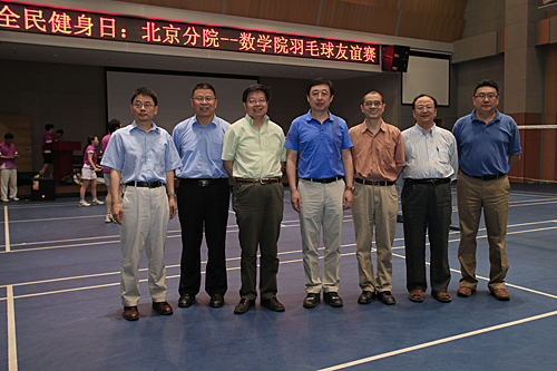 下午16:00点整,职工健身中心揭牌仪式在健身房正式开始。何岩副秘书长和数学院工会主席刘卓军共同为健身房揭牌。在揭牌仪式上,王跃飞院长对何岩副秘书长一行的到来表示欢迎和感谢,希望何岩副秘书长今后继续支持数学院的健身事业。何岩副秘书长号召大家在工作之余,每天抽出一定的时间进行身体锻炼,强健体魄,愉悦身心,健康生活,开心工作,让运动成为每天生活的一部分。他希望,大家能每天运动一小时,健康工作五十年,幸福生活一辈子。之后,在南楼多功能厅,数学院与北京分院羽毛球友谊赛拉开序幕。