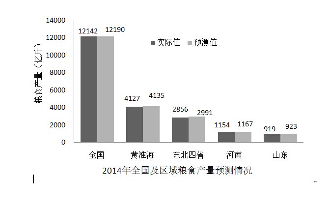 2014年5月份课题组也陆续上报了黄淮海五省区、东北四省区、河南、山东等主产省区的粮食产量预测报告。预测2014年黄淮海五省区、东北四省区、河南和山东的粮食产量将分别达到4135亿斤、2991亿斤、1167亿斤和923亿斤。国家统计局公布的实际结果显示,黄淮海五省区、东北四省区、河南和山东的粮食产量分别为4127亿斤、2856亿斤、1154亿斤和919亿斤。预测结果与实际产量相比,误差分别为0.2%、4.7%、1.1%和0.4%,区域粮食产量预测也达到很高精度。