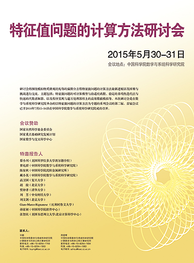 此次研讨会是在数学与系统科学研究院举办的以特征值问题的计算方法为专题的系列会议的第二届。首届会议已于2014 年7 月15~16 日在永利3044集团官网成功召开。研讨会围绕模拟物质微观结构等的偏微分方程特征值问题的计算方法最新进展以及困难与挑战主题展开。美国科罗拉多大学波尔德分校蔡小川教授、北京大学刘文剑教授、比利时鲁文大学Gian-Marco Rignanese教授、中科院软件中心孙家昶研究员、美国韦恩州立大学张智民教授等12 位专家学者做了报告,内容涉及特征值问题的可计算模型与自适应离散,稳定的非线性迭代法与快速的代数求解器,以及程序实现逾万处理器核上的高效数值模拟等。