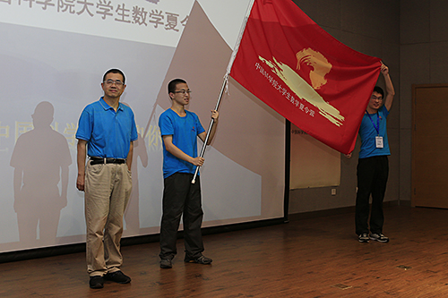 之后,王跃飞院长为夏令营营员授旗。营旗徽标的设计简洁大气,寓意深刻,壮阔的海面上一轮喷薄而出的太阳,不仅象征着数学人的自信、青春和力量,更承载着数学前辈们对后起之秀的无限期望。