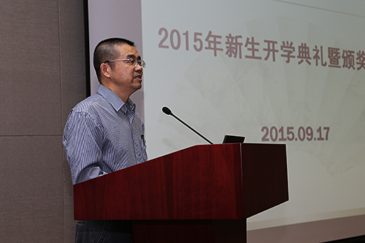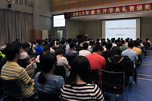 9月17日下午,中国科学院数学与系统科学研究院/中国科学院大学数学科学学院2015年新生开学典礼暨颁奖大会在南楼召开。数学院学术委员会主任杨乐院士、执行院长王跃飞、党委书记兼副院长汪寿阳、副院长巩馥洲等院所领导以及2015级研究生新生、部分高年级研究生、“华罗庚数学英才班”的30位2012级本科生出席了开学典礼暨颁奖大会。本次大会由杨怡欣、武伯尧同学主持。