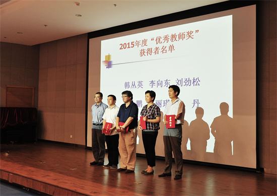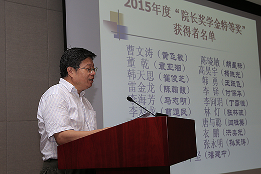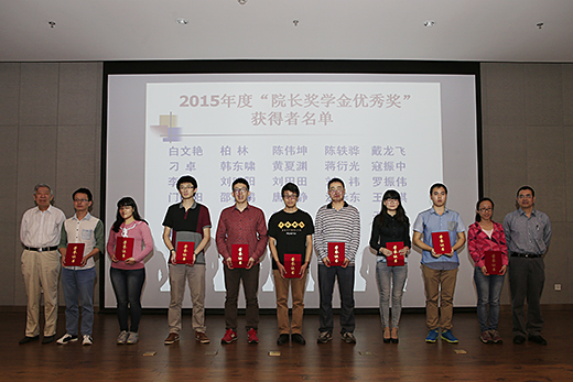 汪寿阳主持颁奖仪式,并宣读2015年度“优秀教师奖”、第十三届“院长奖学金”和第二届“优秀学生入学奖学金”获得者名单。其中,韩丛英、李向东、刘劲松、毛士鹏、王丽瑾、于丹荣获“优秀教师奖”;曹文涛等19位同学获得“院长奖学金”特等奖;白文艳等29位同学获得“院长奖学金”优秀奖;高宸等10位同学获得“优秀学生入学奖学金”。王跃飞、杨乐、巩馥洲分别为获奖师生颁奖。