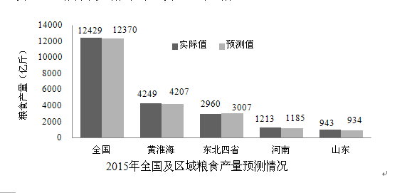 2015年5月份课题组也陆续上报了黄淮海五省区、东北四省区、河南、山东等主产省区的粮食产量预测报告。预测2015年黄淮海五省区、东北四省区、河南和山东的粮食产量将分别达到4207亿斤、3007亿斤、1185亿斤和934亿斤。国家统计局公布的实际结果显示,黄淮海五省区、东北四省区、河南和山东的粮食产量分别为4249亿斤、2960亿斤、1213亿斤和943亿斤。预测结果与实际产量相比,误差分别为-1.0%、1.6%、-2.4%和-0.9%,主产省区的粮食产量预测也达到了很高精度。